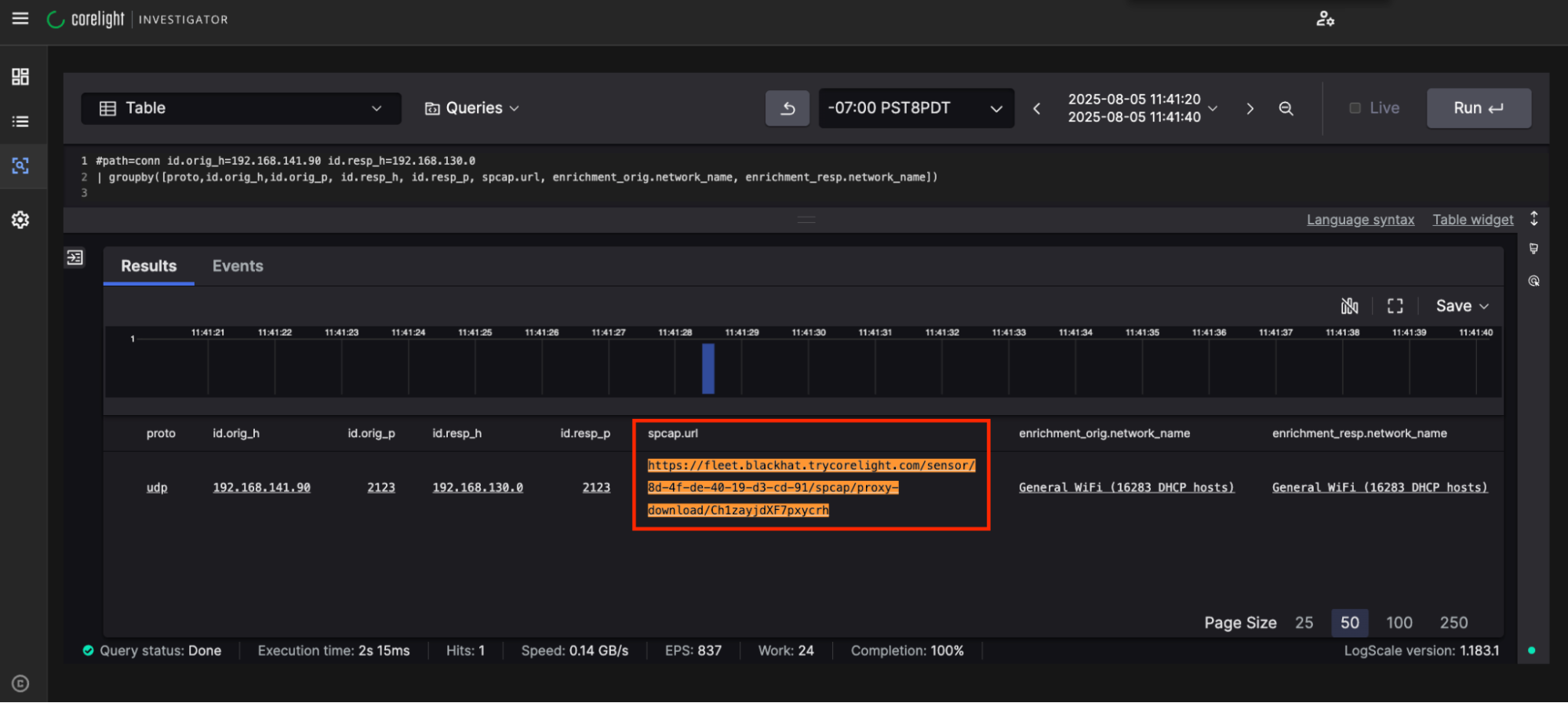 Even though we knew the intent wasn't malicious, I still wanted to see the packets. This was easy enough with Corelight's Smart PCAP, as a link to the PCAP contained in the spcap.url field within Zeek’s conn log as shown below: