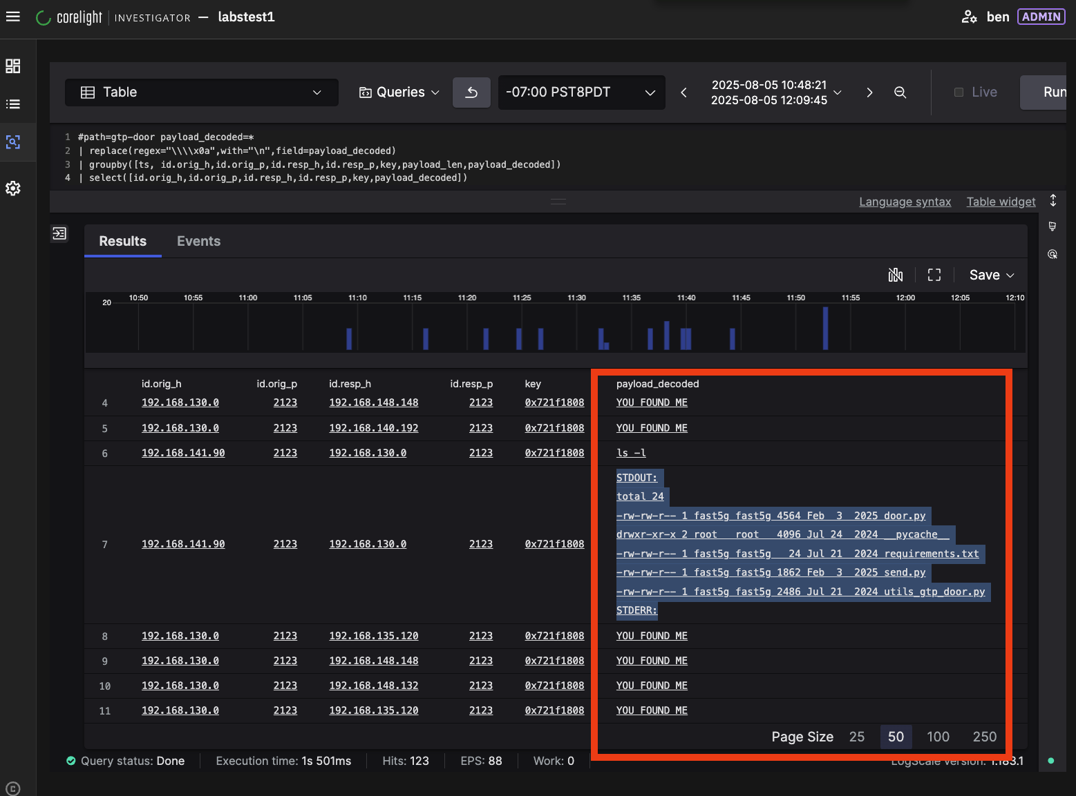 Here is a sample of what the Zeek script found. You’ll note it decoded the ls -l command that I suspected created the directory listing from the manual decode I had already done in CyberChef - this is good validation. There was also “YOU FOUND ME” payloads that were decoded, which is not an unusual style for Black Hat trainers when running training and CTFs.