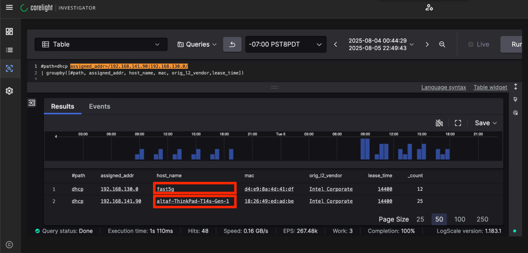 Using our Investigator SIEM (which is powered by CrowdStrike Falcon® LogScale), I quickly found the source and destination IPs from the alert. A quick pivot on the Zeek DHCP logs revealed the hostnames associated with the two IPs.