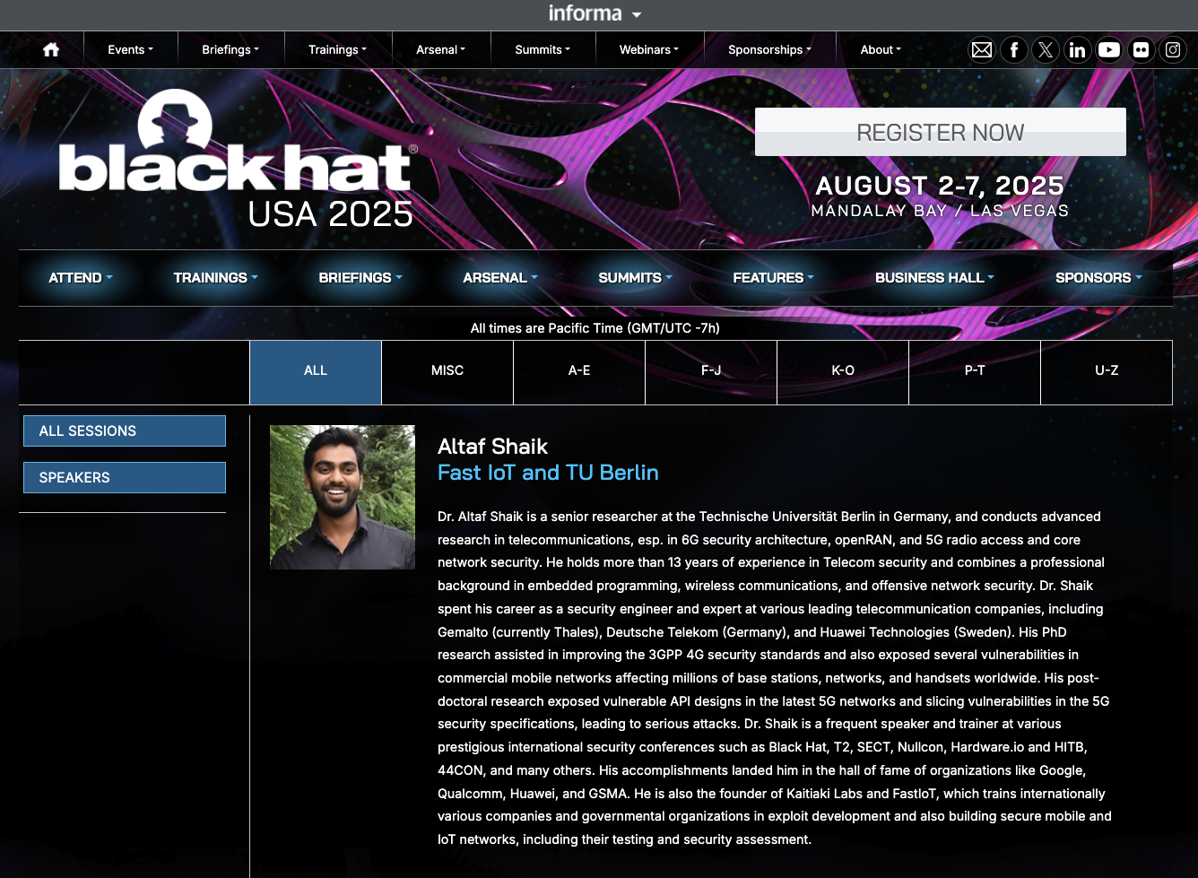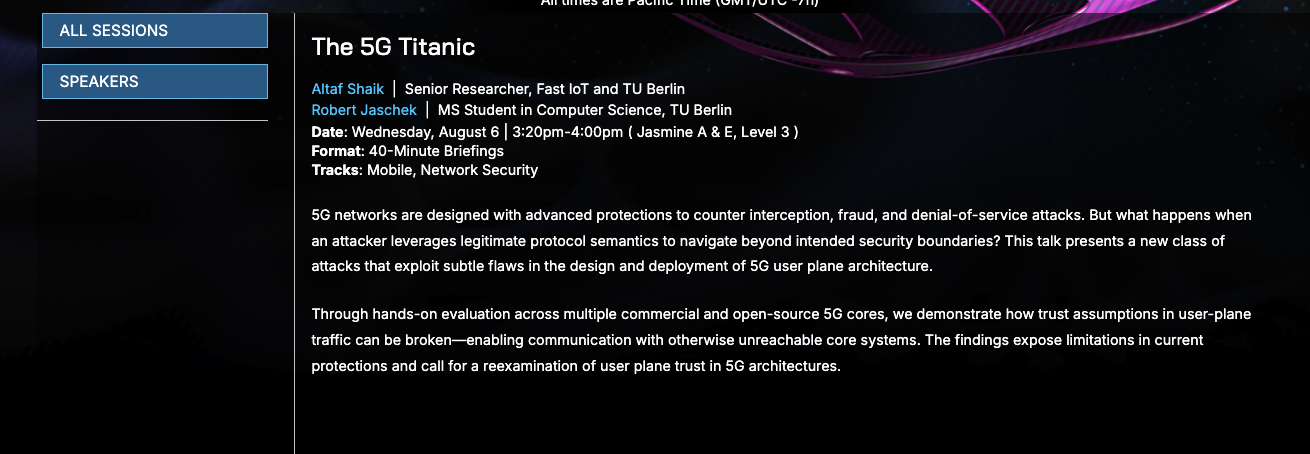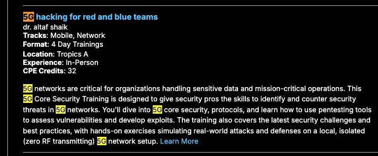 All of this specificity gave rise to a hunch that it might be a researcher, and prompted me to check if there was any content being delivered at Black Hat that might inspire such specific interest. A quick search on the Black Hat site for "5G" revealed there was indeed a training and briefing on the subject.