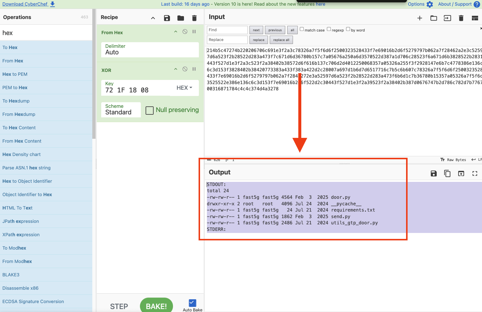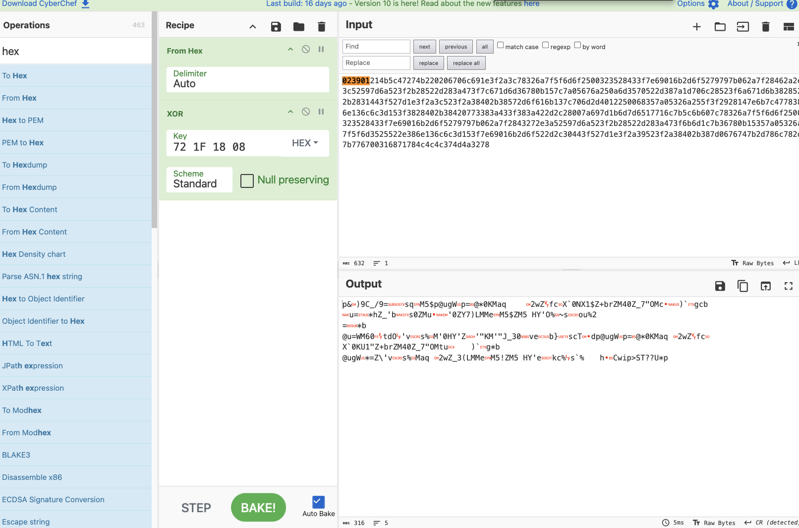 I selected two operations from the left pane and added to our recipe “From Hex” and “XOR.”