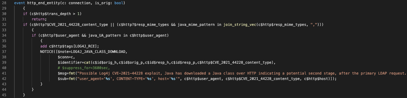Lastly, we process the “http_end_entity” event. HTTP entities can be nested, so first we check to see that we’re processing the outermost (non-nested) entity. We then see whether either we’d already seen an HTTP header indicating that this entity is Java, or that Zeek assigned one or more MIME types to the entity (which it does by “sniffing” the body of the entity) and one of those matches the pattern we’re looking for. If either of these hold, and if the user agent indicates the request came from Java, then we mark the connection as reflecting a successful log4j RCE, and generate a Notice.