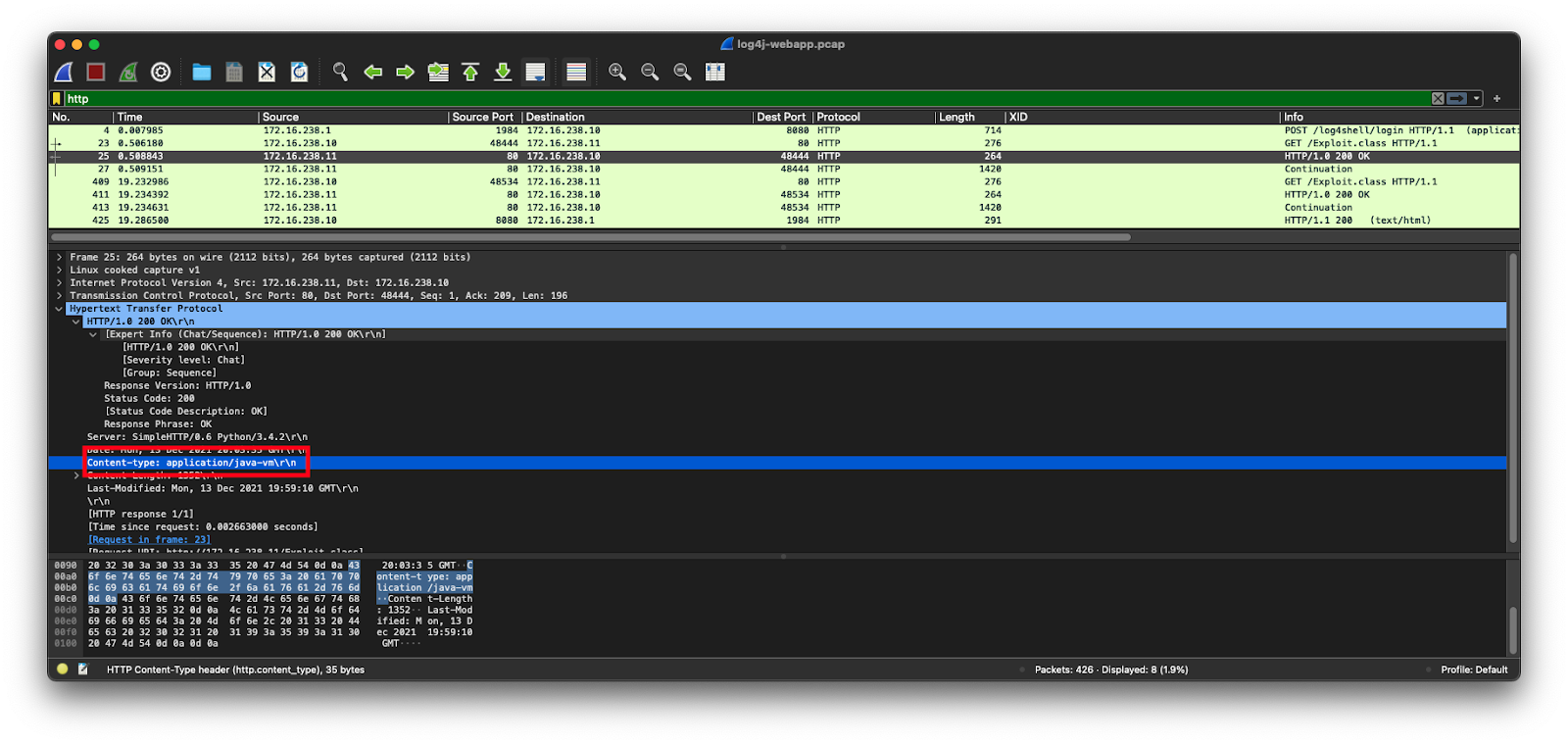 The User-Agent is “Java/1.8.0_51”, signifying Java initiated this download. It is downloading a file called “Exploit.class”, which is a Java class file. The server reports this file as having a MIME type of “application/java-vm”: