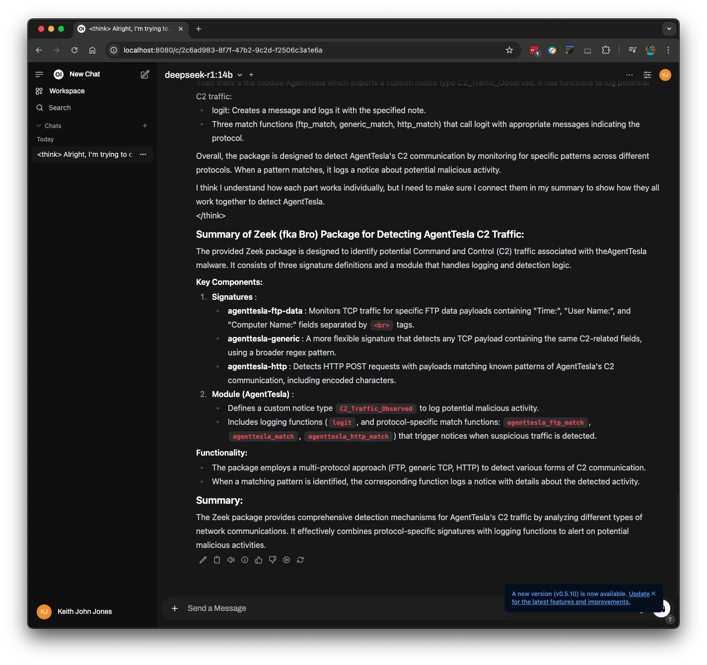 In this scenario, we demonstrate the analysis of an open-source AgentTesla detector, but what if this package was closed source? If the detection technique is proprietary, querying the DeepSeek app would send this package content to DeepSeek’s authors. There is no guarantee that DeepSeek’s authors would not share the data or use it to train newer models. Worse, if the DeepSeek API is compromised, you could send your Zeek detection logic directly to adversaries.