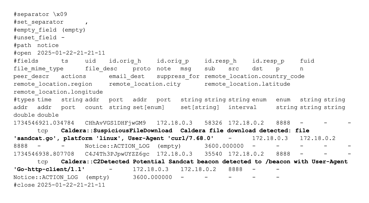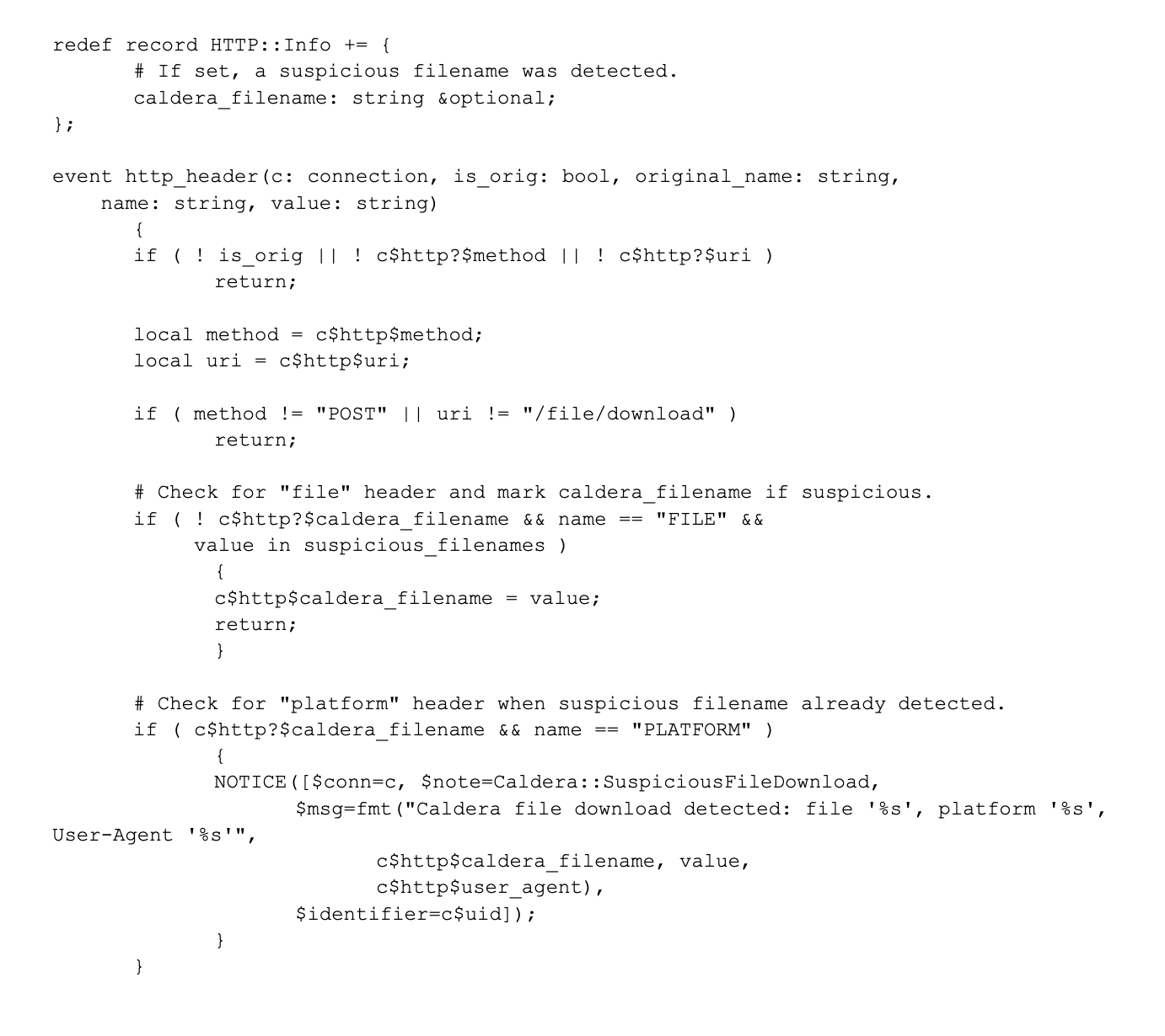 - Custom Notices: Generates a Caldera::SuspiciousFileDownload notice with contextual information such as the filename, platform, and User-Agent string.