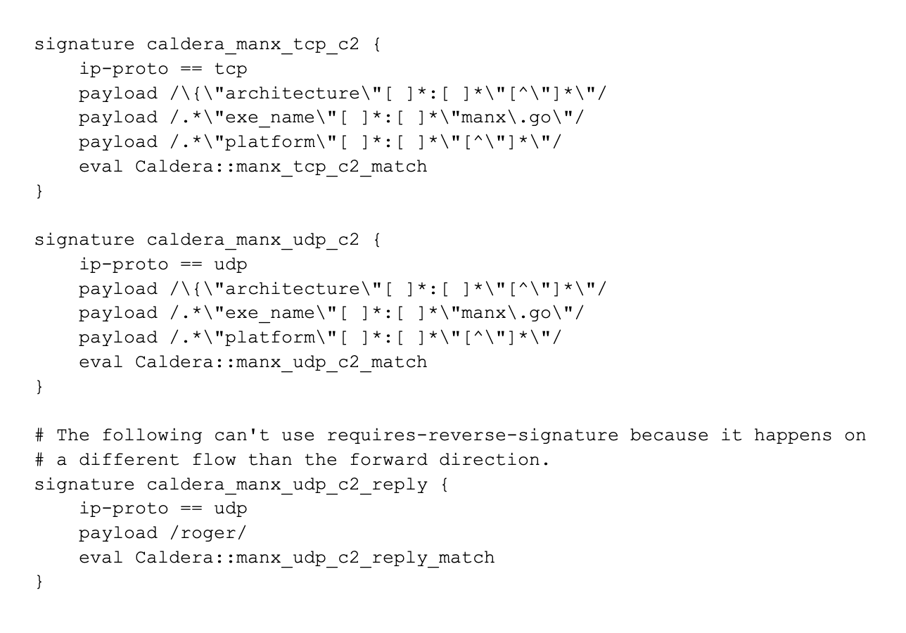 The Caldera detector includes several Zeek signatures to identify network traffic patterns indicative of Manx C2 communications over TCP and UDP protocols: