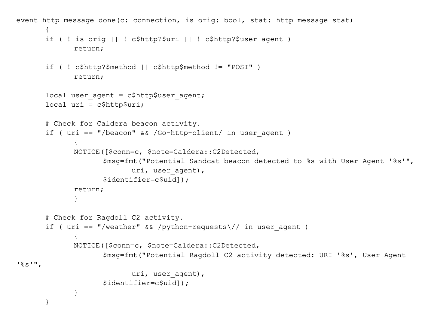 Zeek® is a powerful open-source network security monitoring tool that analyzes network traffic and detects suspicious activity. The Zeek script in this detector’s GitHub repo demonstrates a robust detection mechanism for identifying C2 activities and file download events associated with MITRE Caldera’s agents, such as Sandcat, Manx, and Ragdoll.