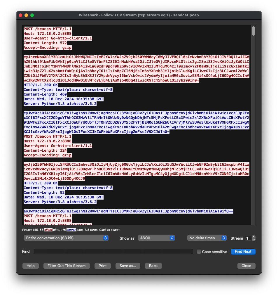 Sandcat C2 uses a Go user agent with the “/beacon” URI. It typically transmits base64 encoded data in the payload, but it could use a different encoding method if the Caldera user changes it: