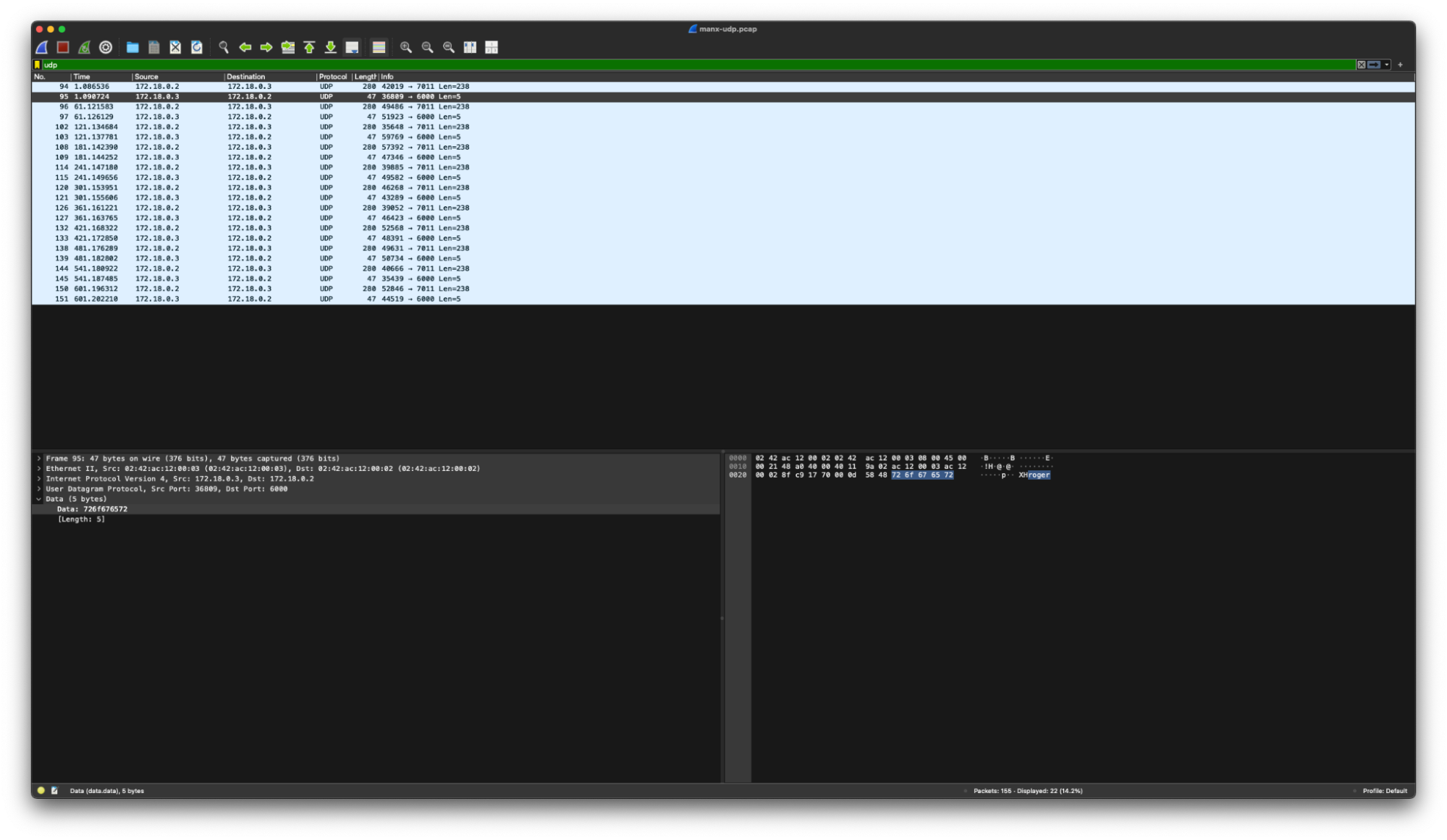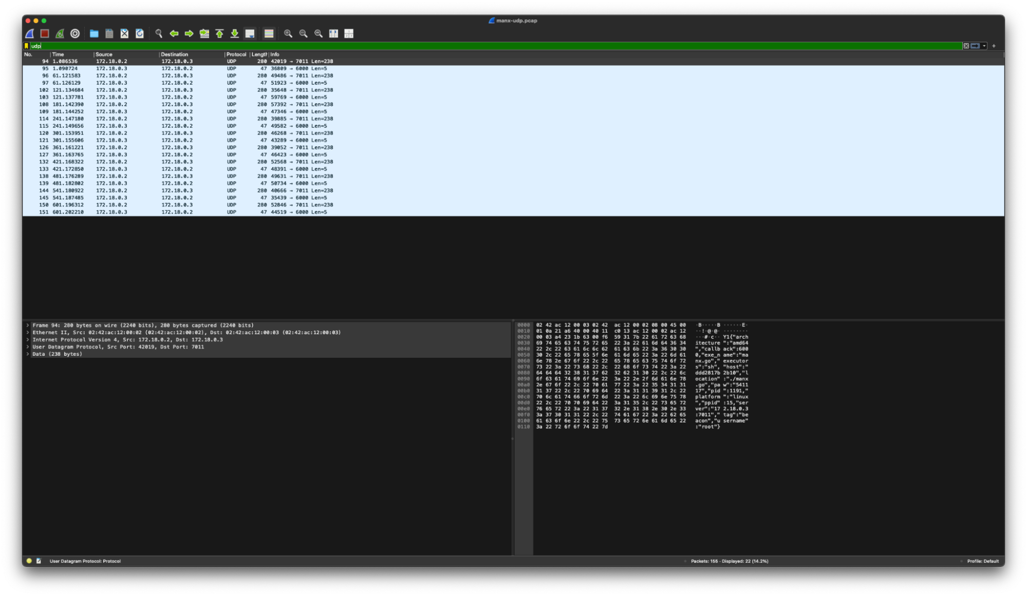 - Reply Matching: A simple signature identifies “roger”, a common acknowledgment keyword in Manx UDP C2 communications.